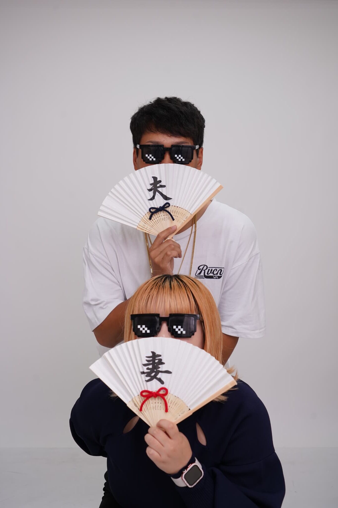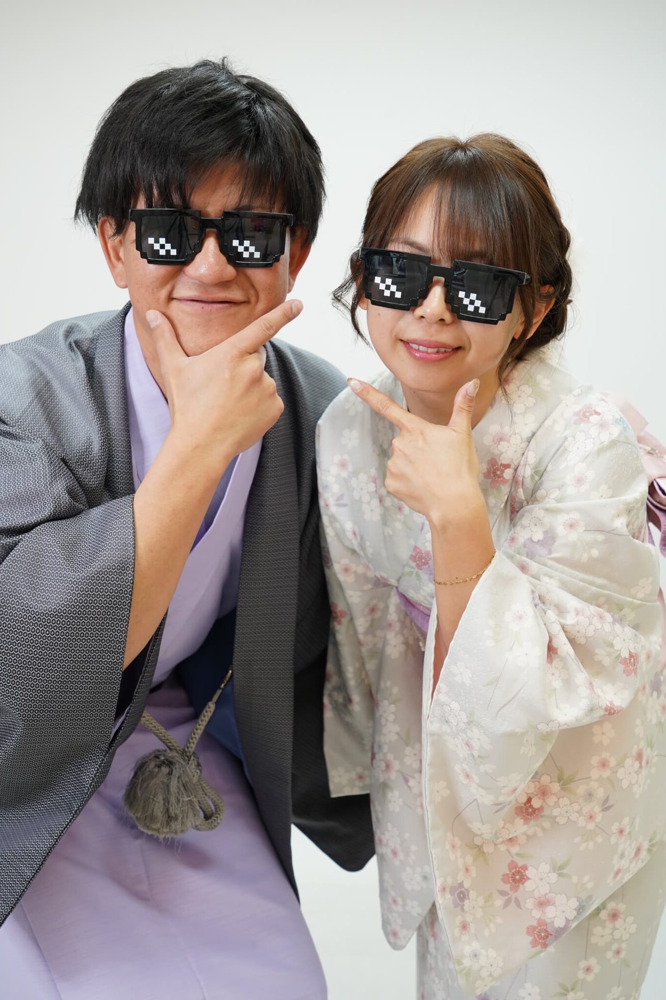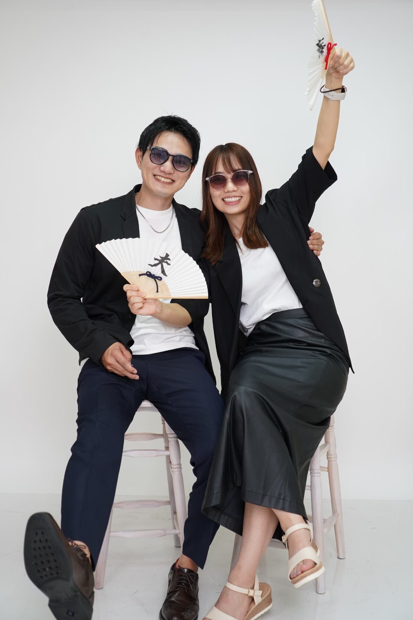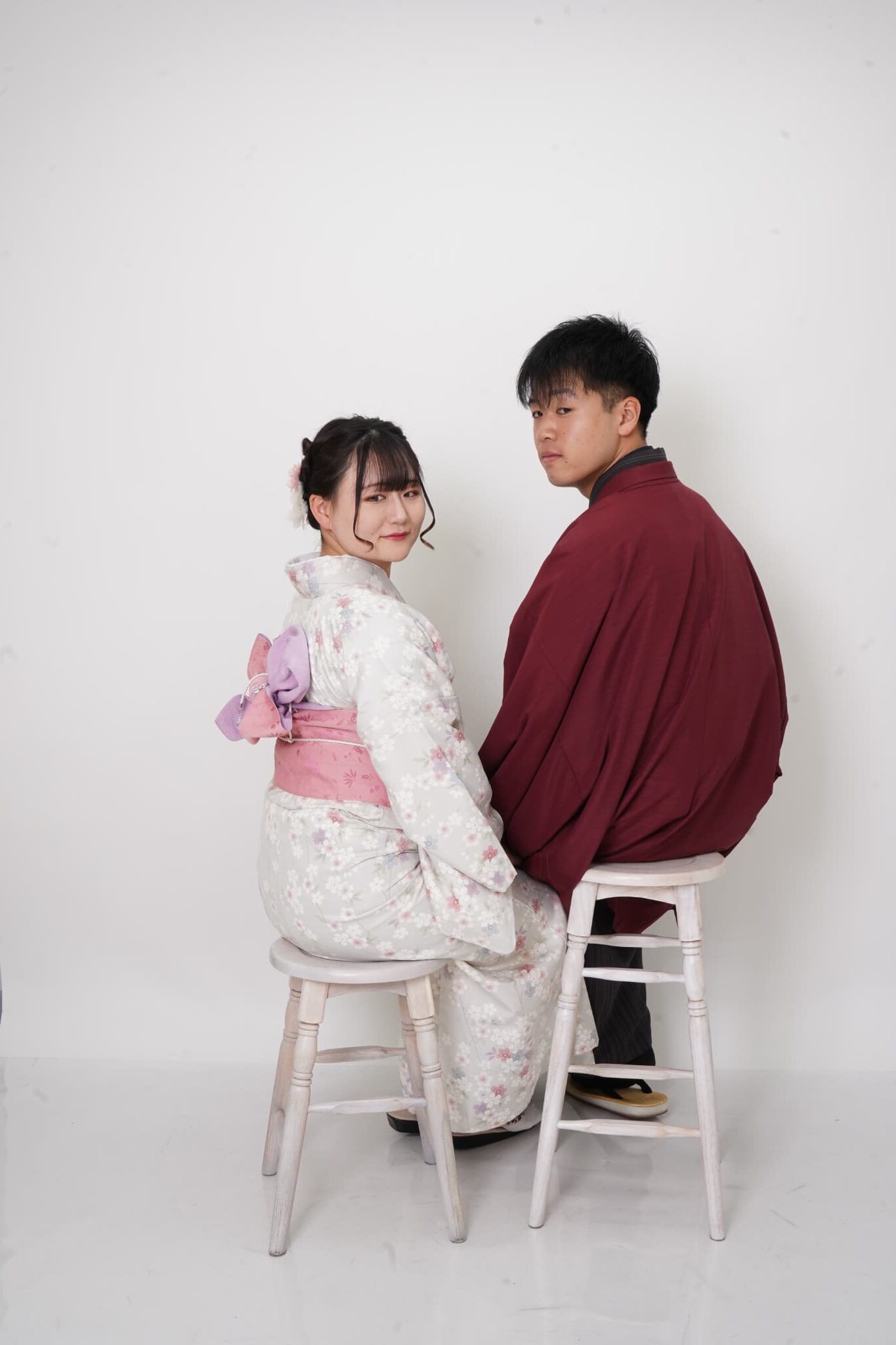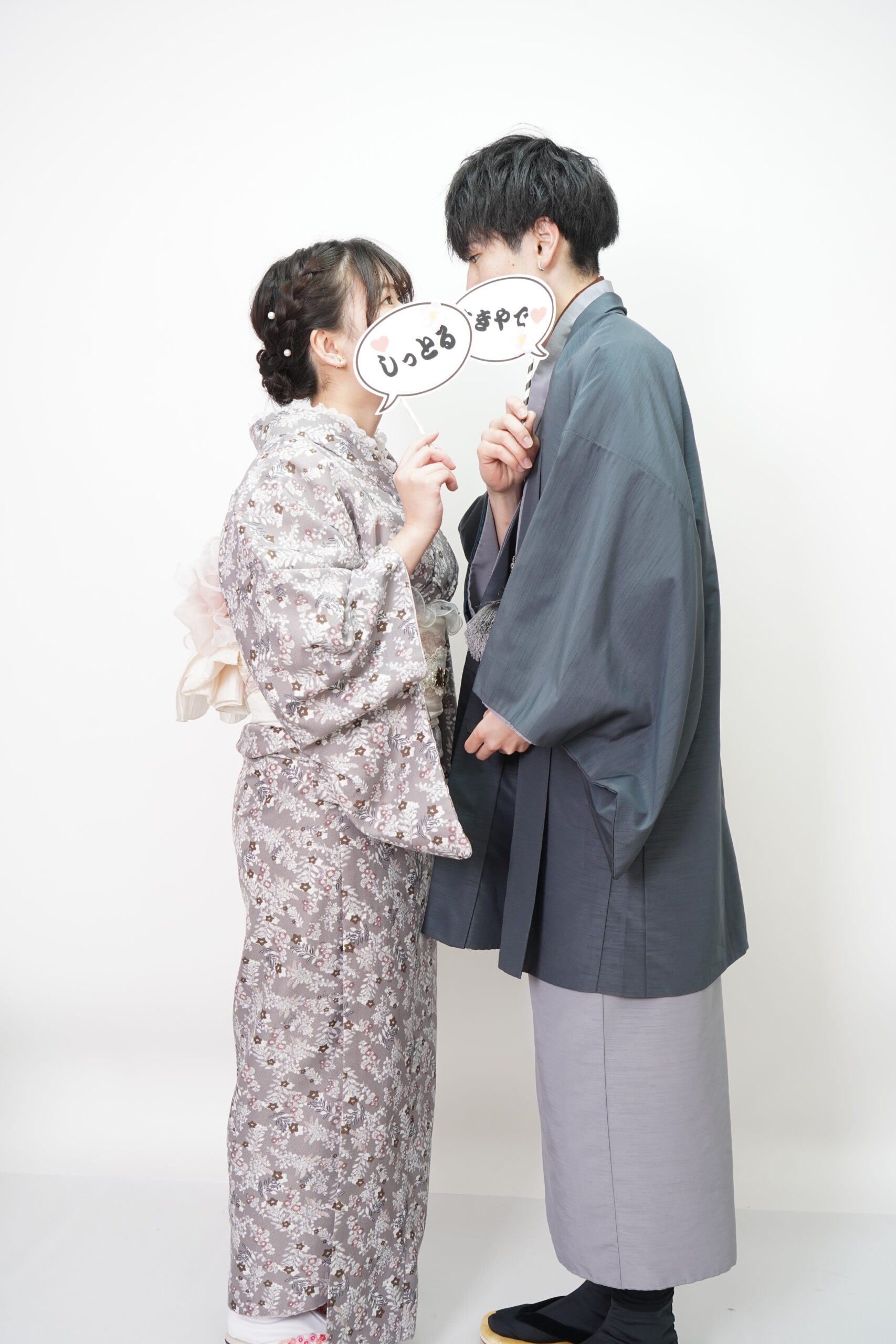 スタジオは白やグレーを基調としたモノトーン。背景がシンプルだからこそ、2人の表情や動きが引き立ちます。コスプレやおそろいコーデにもぴったり。